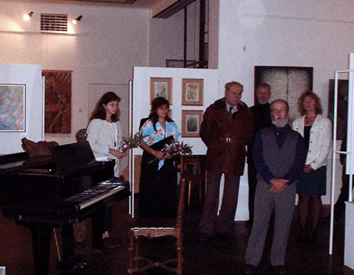 | Z vernisáže 12.10.2002, účastníky vernisáže vítá předseda Ludvík Vašina. |